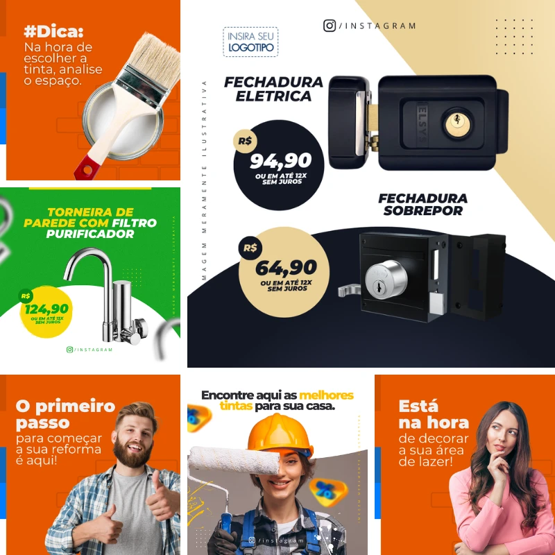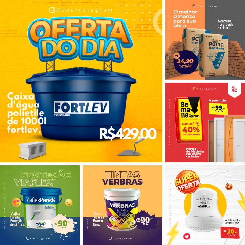 295 Artes Canva Materiais de Construção é um pacote completo de designs prontos para redes sociais, anúncios e campanhas promocionais, e todos são 100% editáveis no Canva. Então você pode adaptar cores, textos e imagens conforme sua marca, mas sem precisar de conhecimentos em design gráfico.